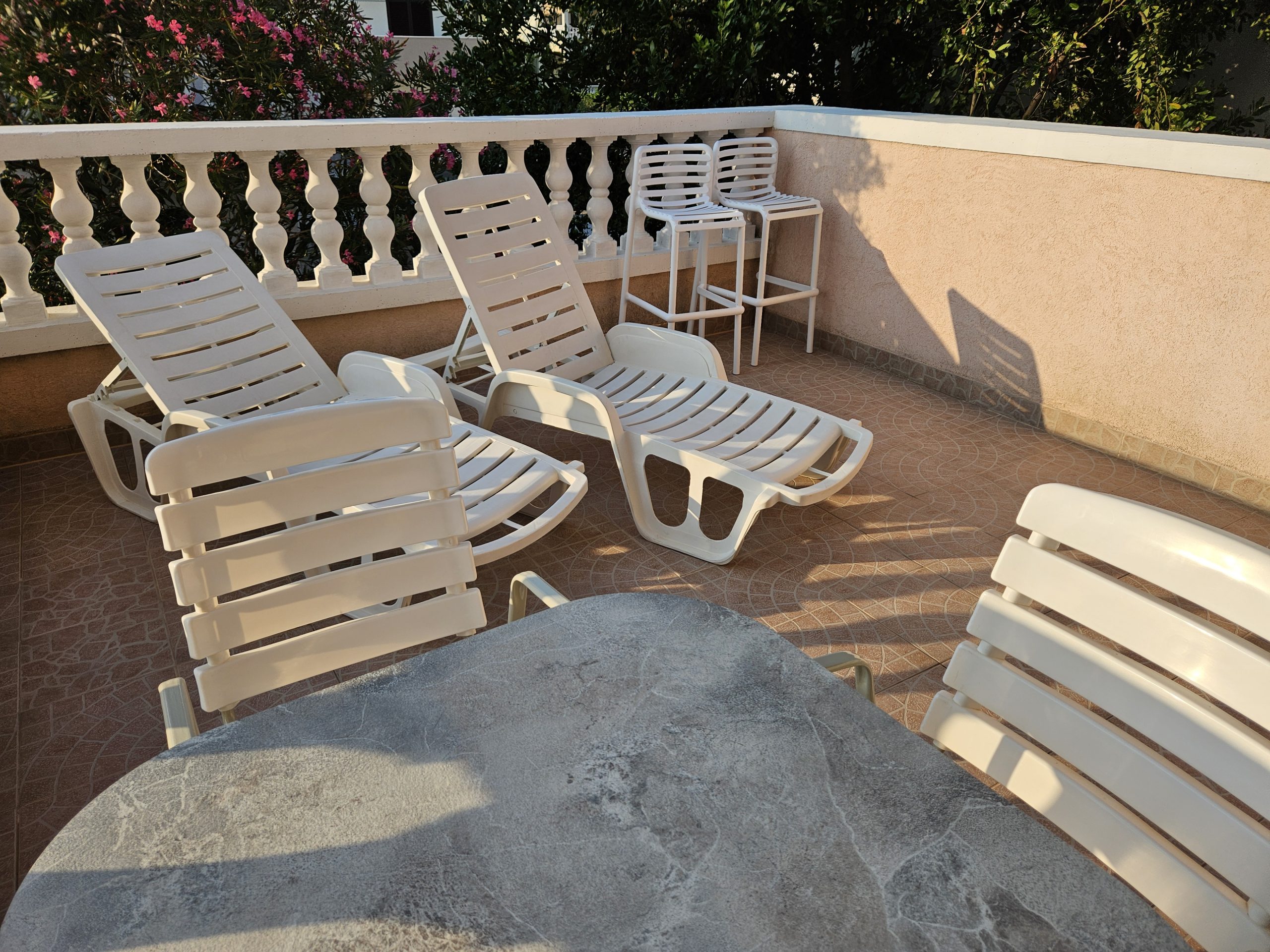 -Exit to a very spacious, partially covered balcony equipped with two deckchairs, table, chairs, parasol, clothes drying rack