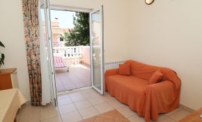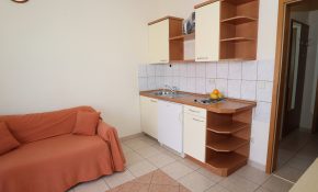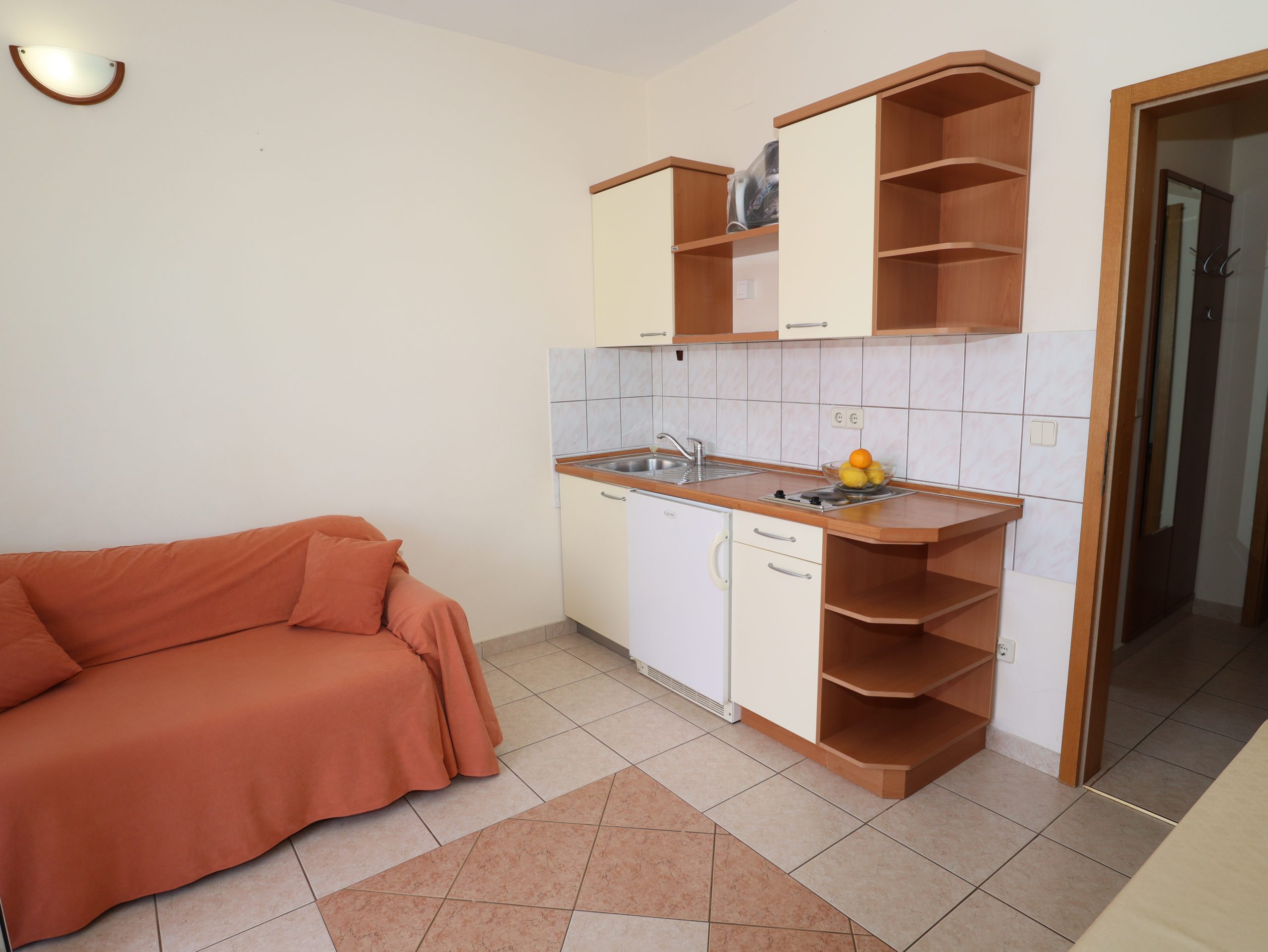 – Living room with kitchen (basically equipped kitchen with fridge, electric hob, kettle, coffee machine, toaster on request, cleaning products, dining table, sofa, TV, air conditioning)