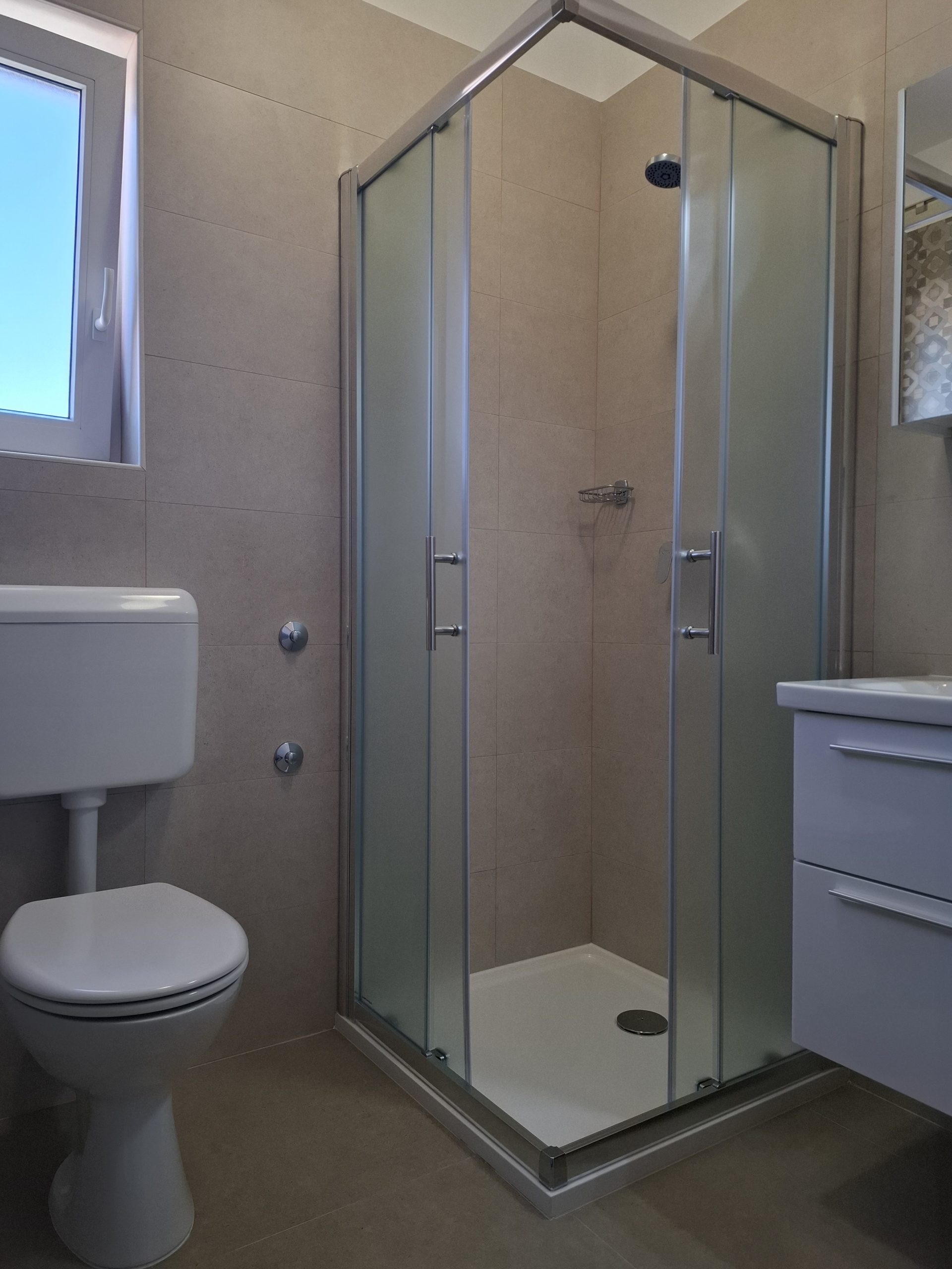 – Living room with kitchen (basically equipped kitchen with fridge, electric hob, kettle, coffee machine, toaster on request, cleaning products, dining table, sofa, TV, air conditioning)